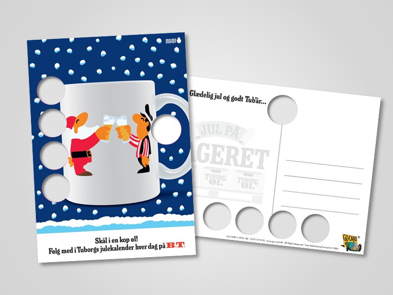 Tuborg har lavet meget populære GO-CARDs, hvor der er stanset huller til fingrene, så man kan stikke dem igennem kortet og holde om julekoppen med øl.