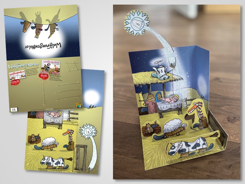 Lindhardt & Ringhof har lavet nogle avancerede GO-CARDs i dobbeltformat i anledning af ny årskalender fra Wulffmorgenthaler. Med perforeringer og bukkestreger kan kortet foldes til et helt 3-dimensionelt krybbespil.