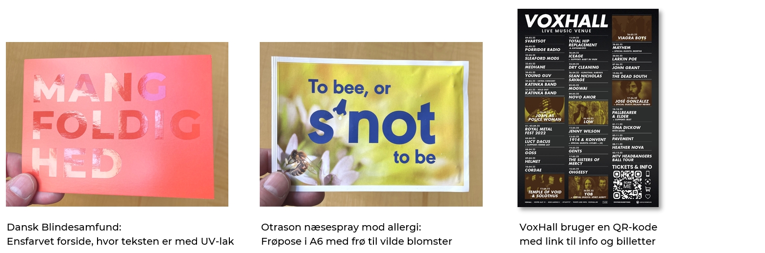 Dansk Blindesamfund bruger desuden relieflak. Og Pepsi-kampagnen bruger duftlak på kortene.