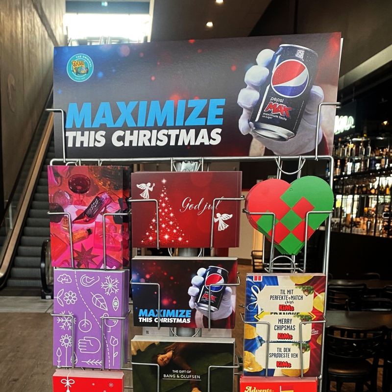 Udover Topboards er der også GO-CARDs i stativerne med Pepsi Max og julemandens hånd.