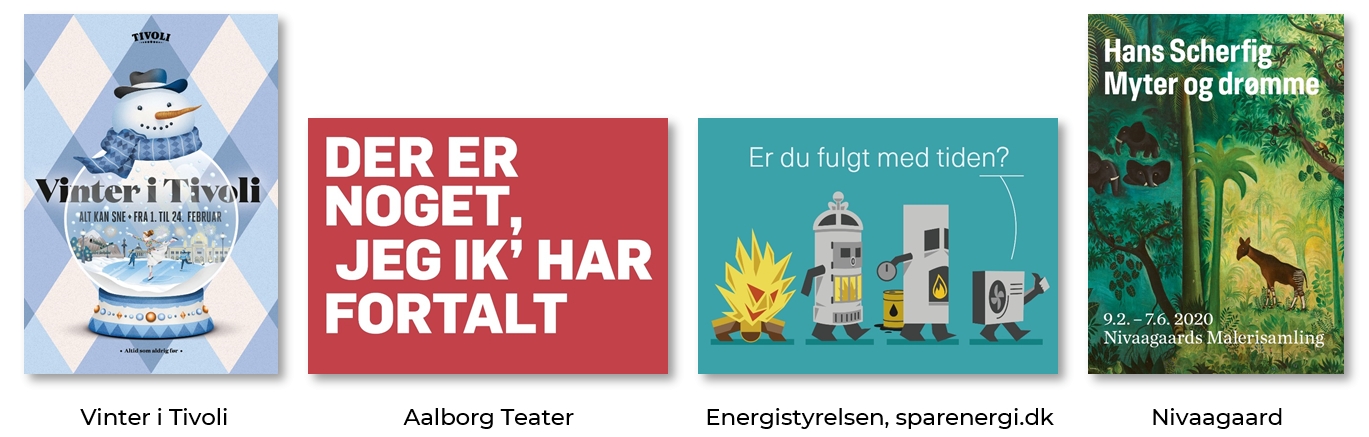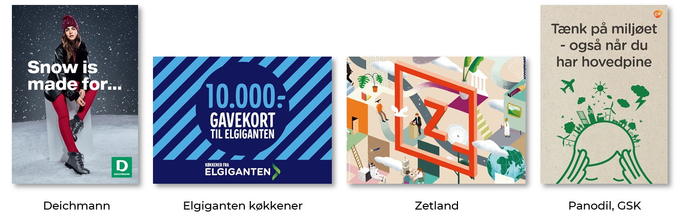 Vi har samlet en stribe eksempler på tidligere vinterkampagner og effektive GO-CARDs som inspiration. Sig til, hvis du vil se flere eksempler på GO-CARDs fra en særlig branche. Eller hvis du vil have sparring på de kreative muligheder i mediet.